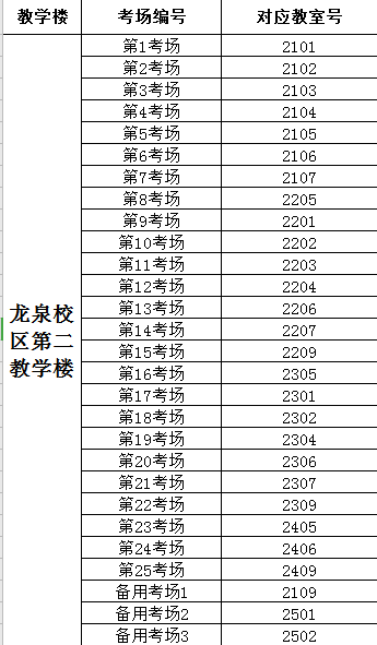 龙泉校区详细地址:成都市龙泉驿区阳光城幸福路10号,考场分布在第二教学楼。