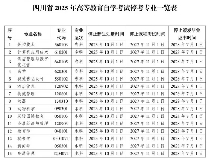 附件:四川省2025年高等教育自学考试停考专业一览表