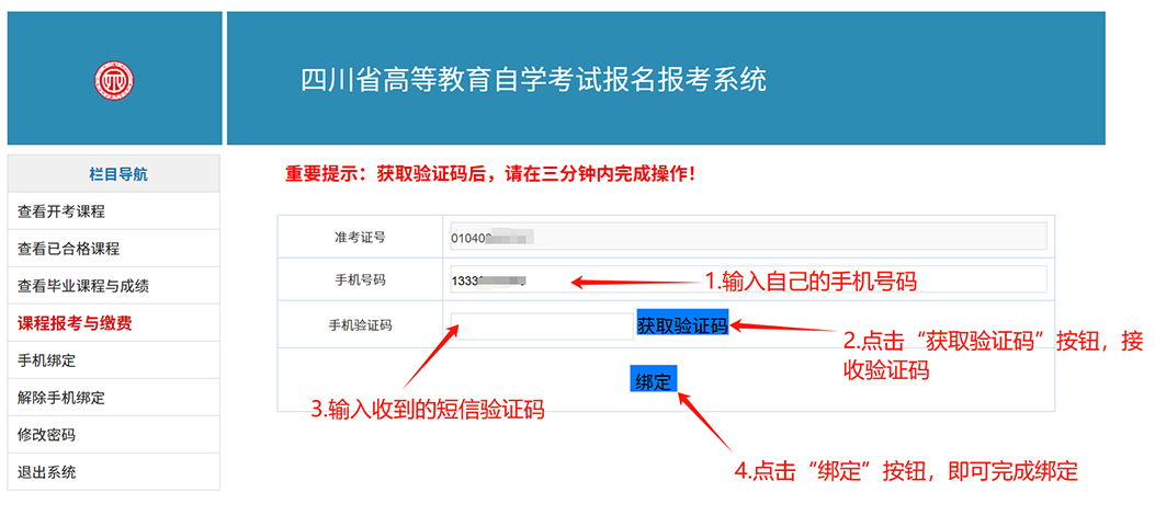 考生可登录系统查看考籍、开考课程等相关信息,并在课程报考前提前绑定手机。