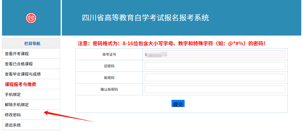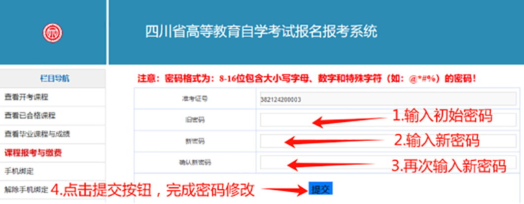 先输入初始密码(在籍考生均以自行设置的密码登录,若未修改过密码,则登录系统的初始密码为本人有效居民身份证号码后6位),再输入新密码并确认一次,“提交”后生效,重新登录即可。