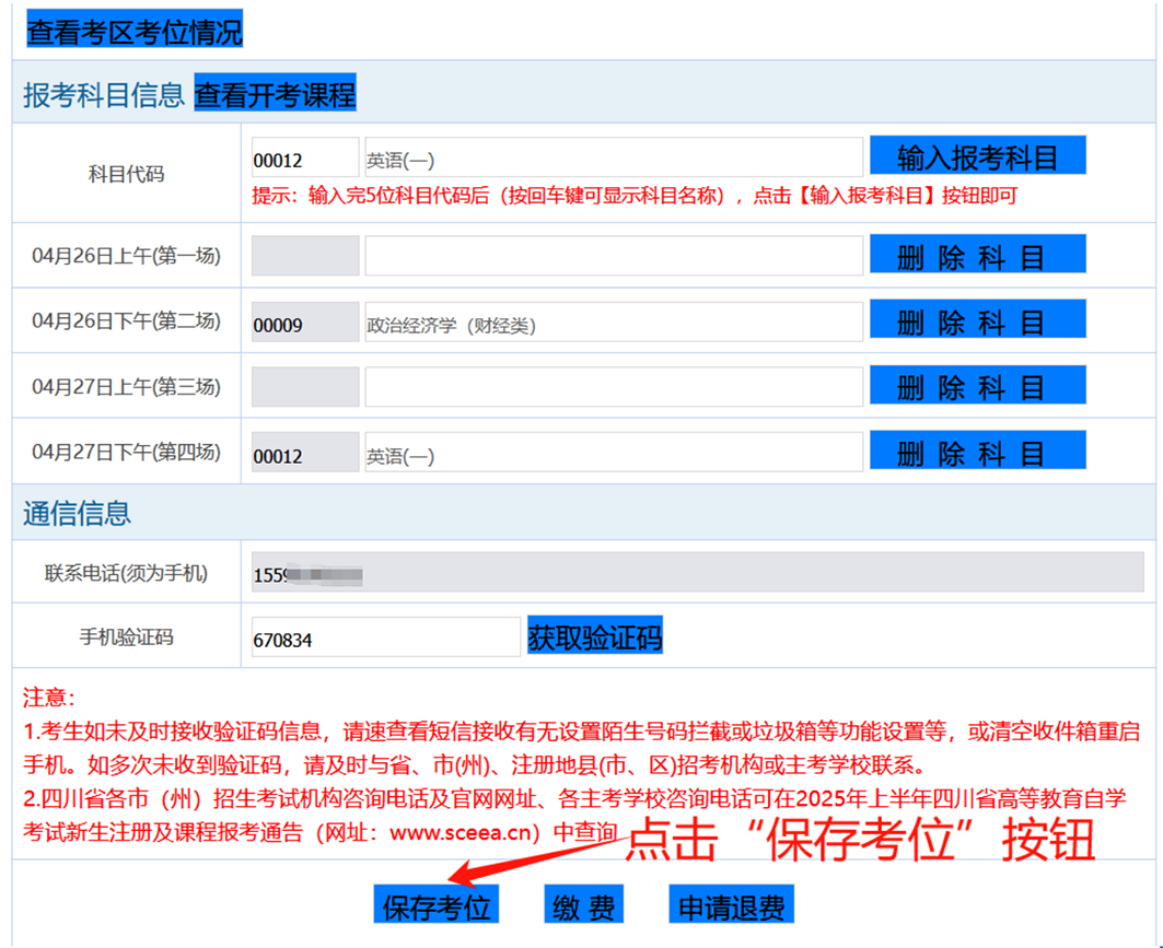 6.输入收到的短信验证码,点击“保存考位”。