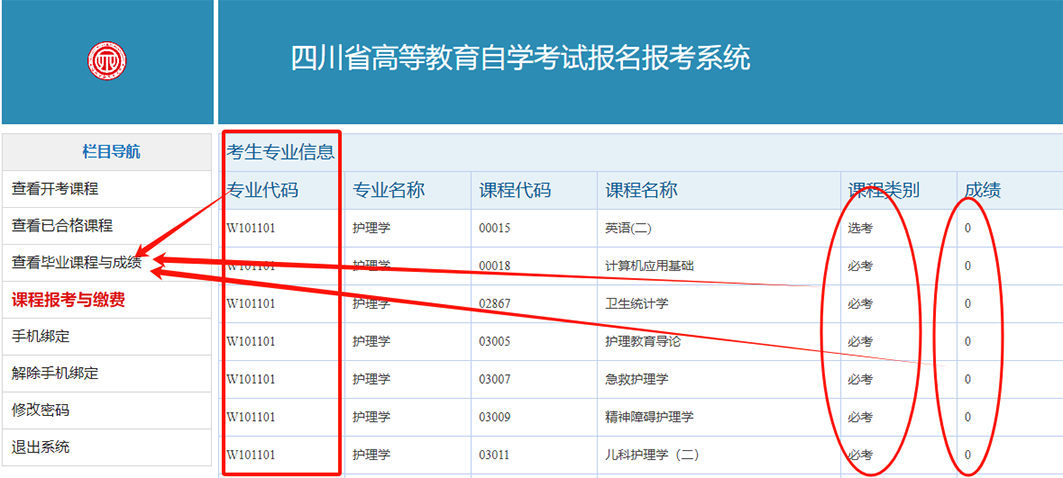 3.查看毕业课程与成绩。点击左边菜单栏“查看毕业课程与成绩”,可以查看本专业下的课程及已获得的成绩。