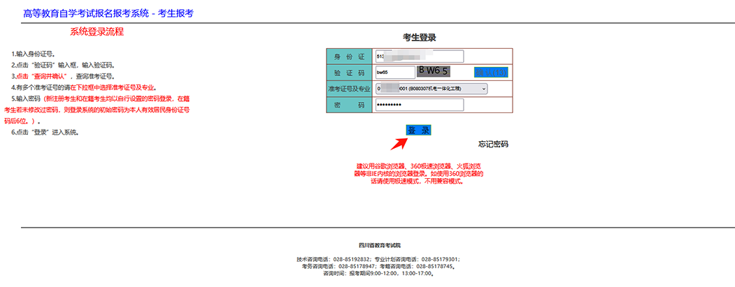 1.选择要报考的准考证后,输入密码,点击“登录”进入系统。在籍考生均以自行设置的密码登录,若未修改过密码,则登录系统的初始密码为本人有效居民身份证号码后6位。
