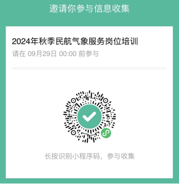 请扫描以下二维码报名,自动气象观测设备保障、气象信息系统设备保障、气象雷达设备保障、民航飞行安全雷电防护培训报名截止时间2024年9月15日,气象预报、气象观测培训报名截止时间:2024年9月28日。