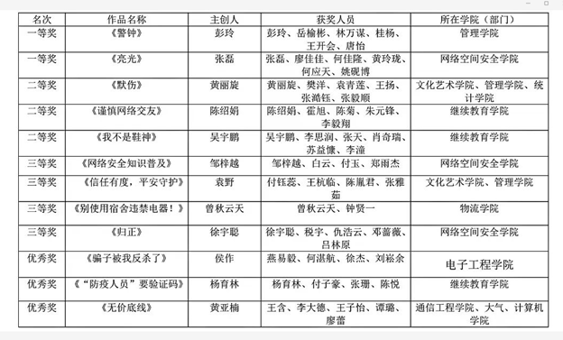 学校开展了以“树牢总体国家安全观 弘扬爱国主义精神”为主题的第五届短视频大赛,鼓励广大师生、校友用独特的视角进行视频创作,创意诠释安全理念与安全文化。本次大赛通过专家评审,经“平安成信”短视频大赛组委会审核,我院荣获:两个二等奖、一个优秀奖、一个最佳人气奖、团体优秀组织奖。
