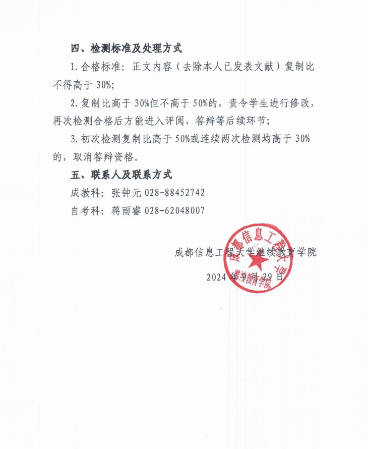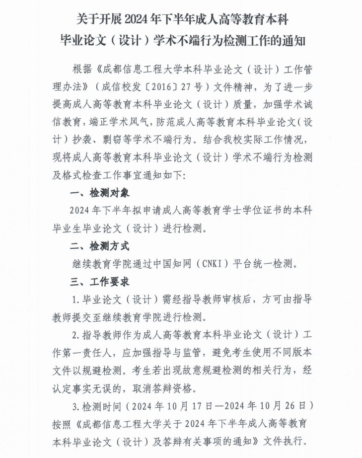 关于开展2024年下半年成人高等教育本科毕业论文(设计)学术不端行为检测工作的通知